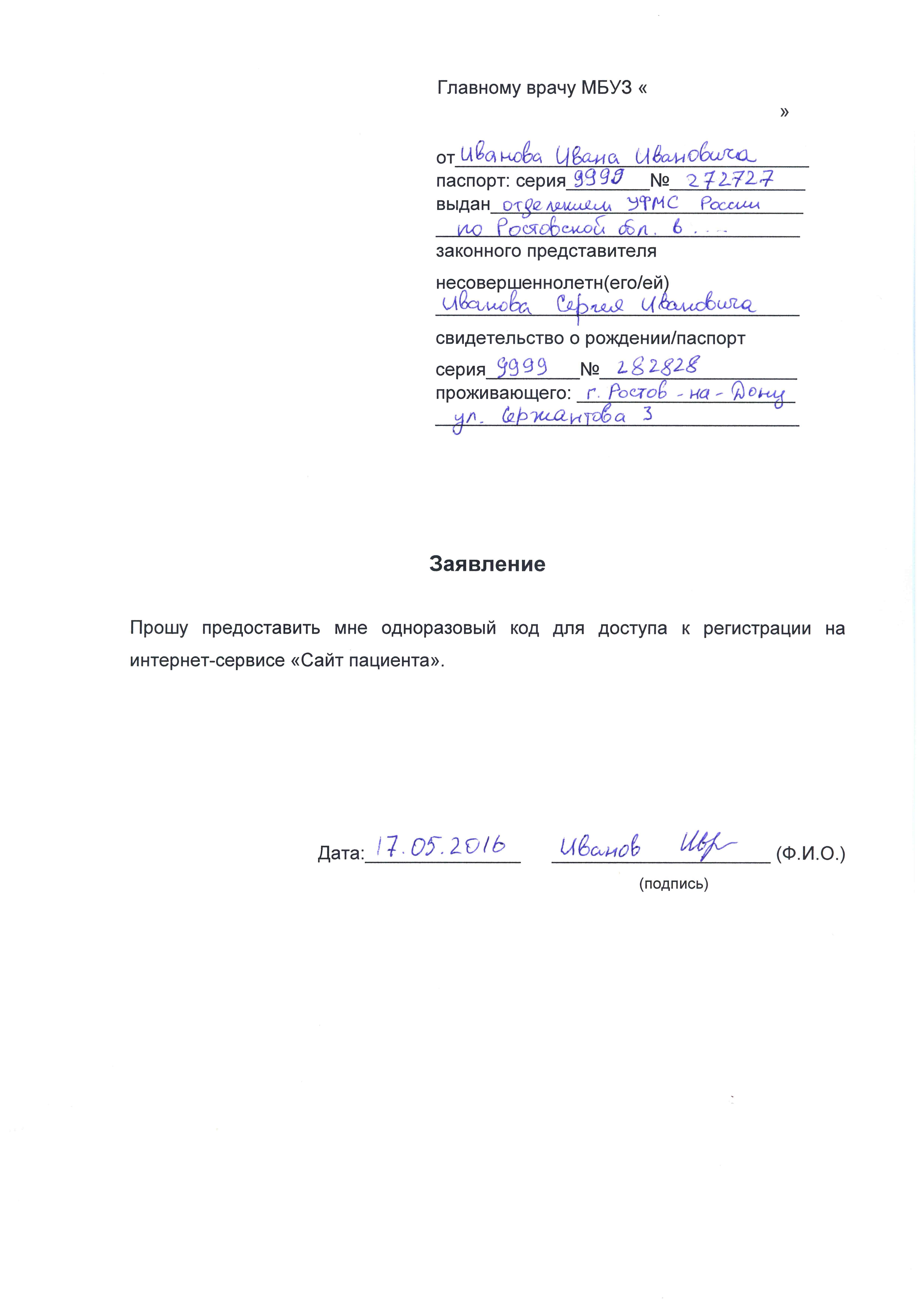 2) Обратиться в районную поликлинику, имея при себе заявление, паспорт родителя или законного представителя, согласно статьи 52 ГК, свидетельство о рождении ребенка, полис обязательного медицинского страхования ребенка